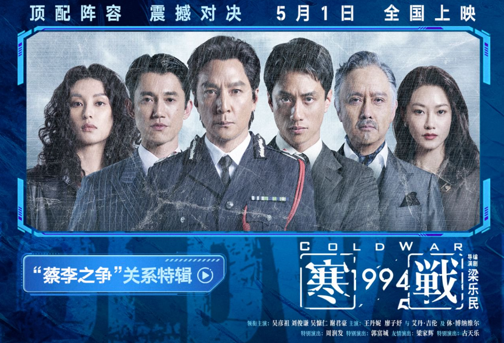 电影《寒战1994》由江志强、陈祉希、柯利明、傅若清担任出品人,由江志强、何韵明、梁乐民、陈祉希、李现曾监制,梁乐民导演及编剧,张飞帆、何亮瑜、张戬仁编剧,吴彦祖、刘俊谦、吴慷仁、谢君豪领衔主演,王丹妮、廖子妤与艾丹·吉伦及休·博纳维尔主演,周润发、郭富城特别演出,梁家辉友情演出,古天乐特别演出。由无锡加雄影业有限公司、万达影视传媒有限公司、安乐影片有限公司、上海儒意影视制作有限公司、中国电影产业集团股份有限公司、安乐(北京)电影发行有限公司出品,之江电影集团有限公司、北京微梦创科网络技术有限公司联合出品,将于5月1日正式上映,敬请期待!