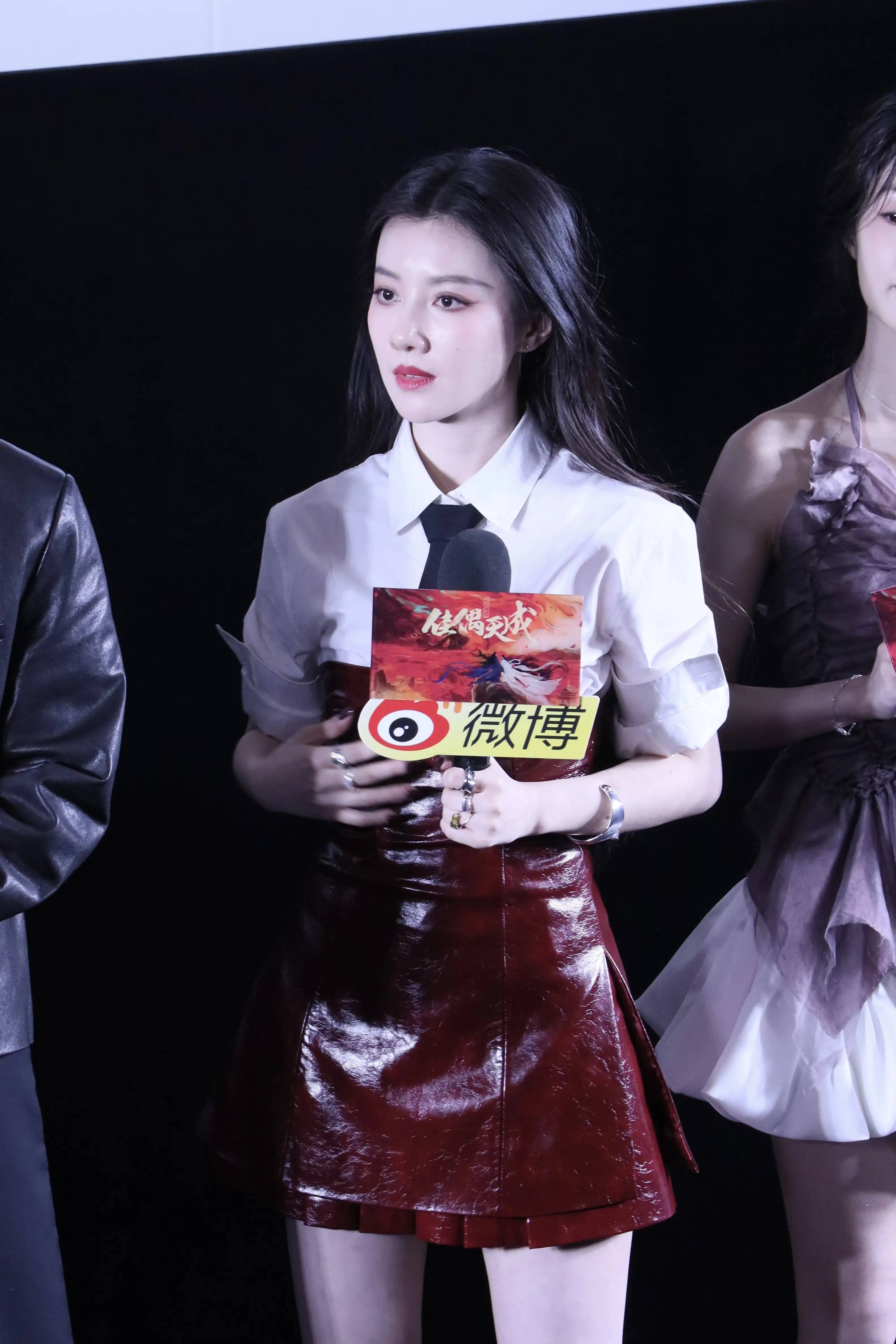 任嘉伦身着黑色皮衣外套搭配长裤,尽显酷飒帅气;王鹤润则身着双色拼接连衣裙配长靴,颇为时髦靓丽。